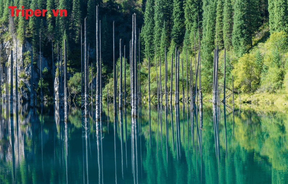 Hồ Kaindy – hồ nước nằm trong dãy núi Tian Shan, được hình thành do một trận lở đất lớn vào năm 1911 đã chặn dòng sông Kaiyndy, tạo thành một hồ nước tự nhiên. Hồ nổi tiếng với những thân cây vân sam nhô lên từ lòng hồ trong suốt. Những cây này đã bị lở đất chôn vùi dưới lòng hồ và bị mắc kẹt lại đây nhưng vẫn còn nguyên vẹn sau nhiều năm.