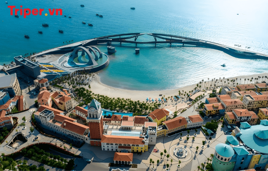 Sunset Town mang đậm màu sắc Địa Trung Hải, với quần thể gần 60 công trình biểu tượng độc đáo được lấy cảm hứng từ nước Ý như: Quảng trường La Mã, Cầu Hôn (Kiss Bridge), Thành cổ Pompeii, Biểu tượng Khải Hoàn Môn, Show Vortex, Tháp đồng hồ đỏ gạch cao 75m, Quảng trường con sò Seina Sun,… và nhiều điểm check-in tuyệt đẹp khác.