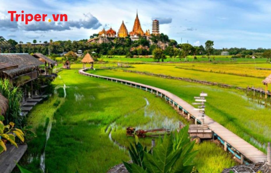 Chùa Wat Tham Suea – còn dược biết đến với tên gọi Chùa Hang Cọp hay Đền Cọp. Tại đây, dưới chân Đền là một trong những quán café đẹp nhất tỉnh Kanchanaburi với view cánh đồng lúa.
